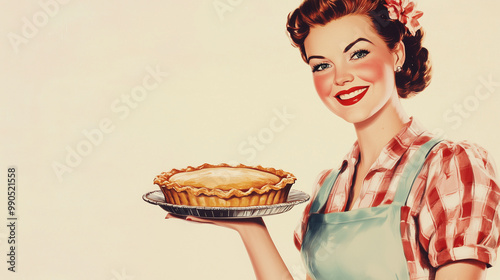 A vintage commercial style illustration of a perfect retro style traditional housewife in candy colours, smiling and holding a fresh baked pie. Wide landscape 16:9 with copy space, text blank