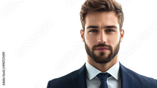 Elegancko ubrany mężczyzna, z profesjonalnym i zdecydowanym wyrazem twarzy, na przezroczystym tle.
