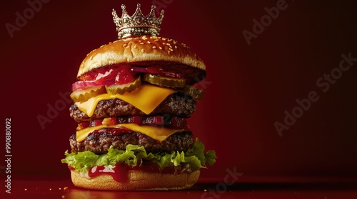 Burger stacked high with cheese, lettuce, and a shiny crown resting on top, set against a deep red studio background.