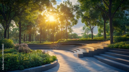 A sunlit park with curved amphitheater seating, modern landscape design, and lush green trees, accentuated by serene golden hour lighting and architectural elements.