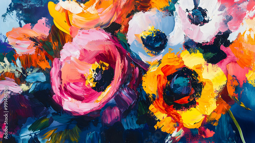 Pintura sobre lienzo de estilo expresionista floral botánico que muestra una combinación de colores y tonos atrevidos