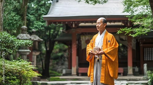 21. A Shinto priest performing rituals at a picturesque shrine
