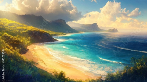A vibrant seaside view with rich, blue water, a beautiful sandy beach, and diverse green