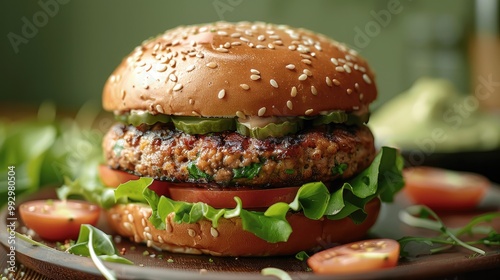 A beautifully plated vegan burger with fresh lettuce, tomato. Generative AI.