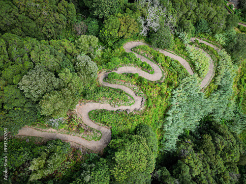 Top aerial view of a winding mountain footpath. Forest hairpin curvy hiking trail near Faial da Terra, Sao Miguel Island, Azores, Portugal