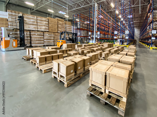 Wnętrze magazynu logistycznego, hala magazynowa, regały, paczki, wózek widłowy. Dystrybucja towarów, ładunek na paletach.