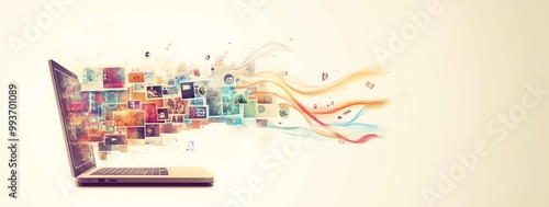 A banner style illustration of a laptop with a flow of information, apps and thumbnails coming from it, graphic resource, copy space for text, cream background