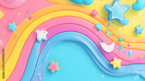 fondo infantil colorido creativo con decoraciones de colores como estrellas y nubes con un arco iris arcoiris decorativo en colores pastel para invitacion con diseño divertido y tierno
