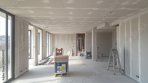 Instalacja płyt gipsowo-kartonowych, które posłużą do wykończenia ścian gipsowych w mieszkaniu. Prace te są częścią większego remontu, który ma na celu modernizację wnętrza.