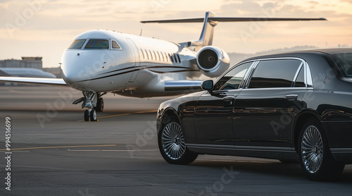 View of black luxury limousine car with private white jet in the background at the airport, private luxury escort