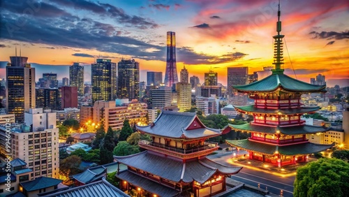 Vibrant Tokyo Cityscape with Skyscrapers, Neon Lights, Traditional Temples and Scenic Parks