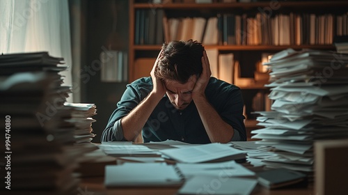A Man Overwhelmed by a Mountain of Paperwork in an Office Setting