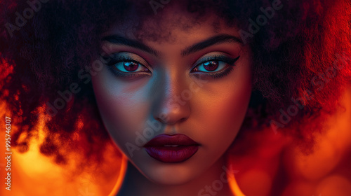 A close-up portrait of a woman with captivating features. She has intense, almond-shaped eyes accentuated with bold eyeliner and deep-colored eyeshadow. Her lips are painted a rich shade of burgundy.
