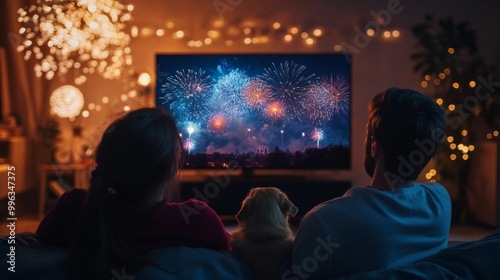 Happy Couple Dog Watching Fireworks Display on Television in Living Room