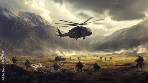 Military operation in a mountainous landscape with soldiers and a helicopter.