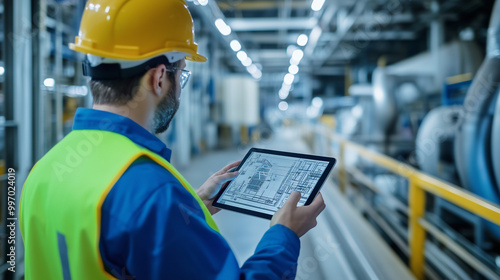Inżynier w nowoczesnej hali produkcyjnej wykorzystuje dane na tablecie do prognozowania konserwacji maszyn, co stanowi kluczowy element Przemysłu.