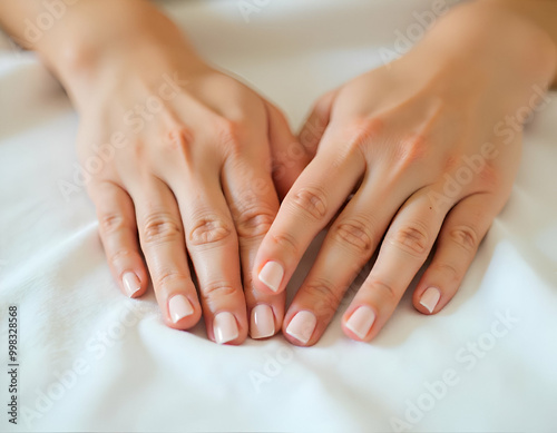 A close-up of a woman's hands with white manicured, natural-looking nails resting on a soft, white fabric