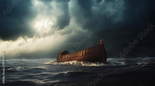 Uma representação bíblica da arca de Noé enfrentando o dilúvio enviado por Deus