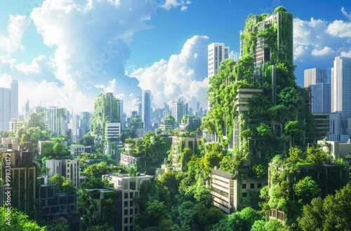 Lush greenery overtakes skyscrapers in a futuristic cityscape.