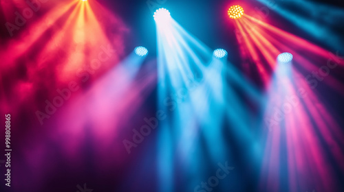 Na scenie rozbłyskują kolorowe reflektory, które tworzą abstrakcyjne tło iluminacji koncertowej. Ich jasne światła migoczą w rytm muzyki, tworząc niesamowite efekty wizualne.