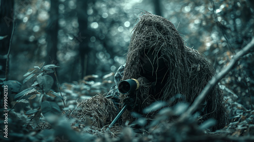 Sniper in camouflage suit, hidden in forest, holding rifle with scope, concealing among vegetation, tactical operations concept