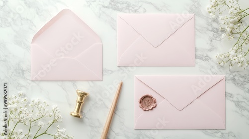 Wedding stationery set on marble desk top view. Blank paper card mockup pastel pink envelopes with wax seal stamp gypsophila flowers.