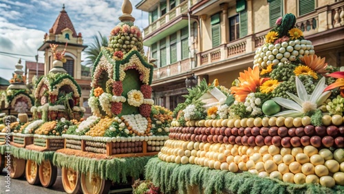Kadayawan Festival, rows of floats decorated with flowers and fruits, colorful Davao city buildings in the background,