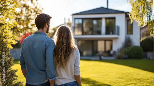 Rodzina, trzymając się blisko siebie, stoi z tyłu swojego wymarzonego domu, gotowa na nowe wyzwania i wspólne chwile w nowym miejscu.
