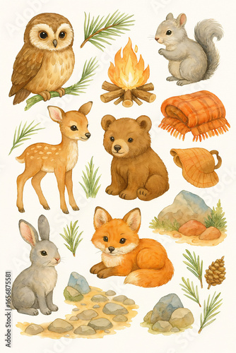 Forest friends owl squirrel rabbit fox bear deer by campfire with pinecone and blanket