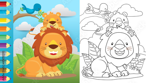 Vector cartoon of lion and its cub on leaves background with a bird perch on tree branches