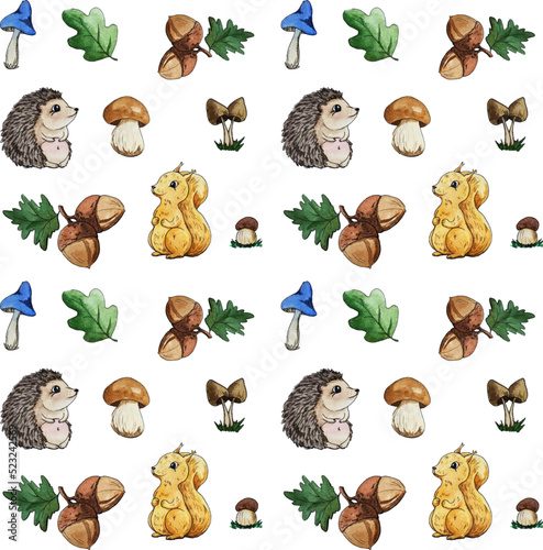 Seamless watercolor pattern. Forest animals. Autumn. Watercolor autumn pattern. Squirrel. Hedgehog. Acorns with leaves. Children's fabric pattern. Watercolor texture. Cute forest animals.