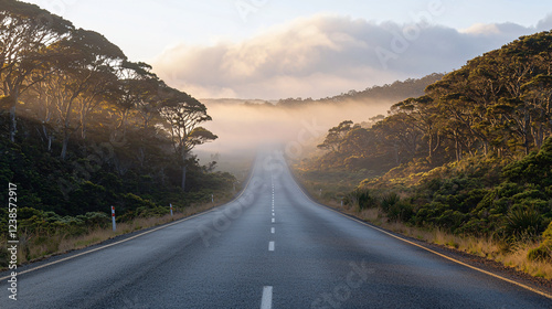 A long, empty road disappearing into the soft morning fog, surrounded by quiet trees, evoking a peaceful yet mysterious atmosphere.