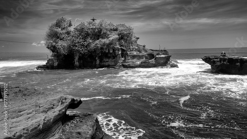 Famous Tanah Lot temple in Bali captured during golden hour with reflections and sea landscape