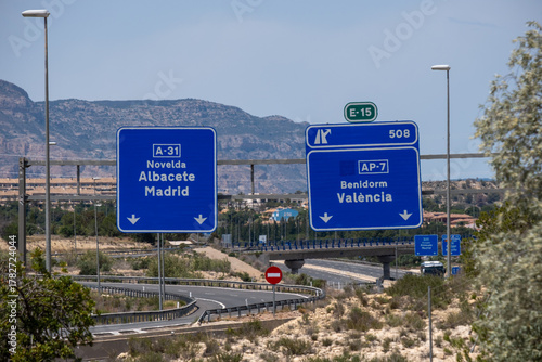 Highway signs pointing to albacete and madrid on a-31 in spanish countryside