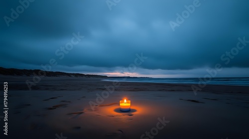 Glowing candles illuminate empty beach at dusk, dramatic stormy clouds hover over dark ocean horizon with faint sunset light.