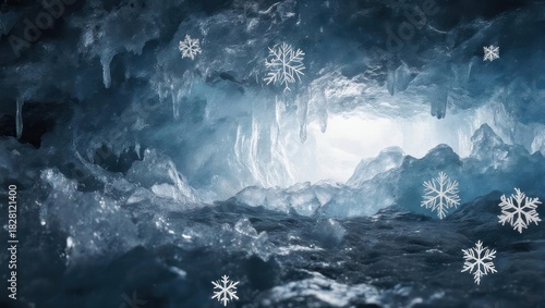 Inside an icy cave with sparkling formations, and floating snowflakes