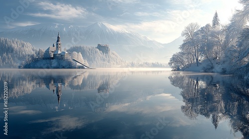 A winter morning scene with a snow-covered lake, a church, and snow-capped mountains reflecting in the calm water.