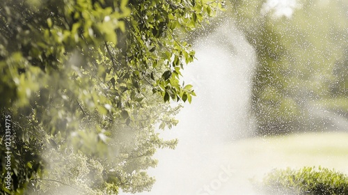 Misty Forest Atmosphere with Sparkling Water Droplets and Greenery