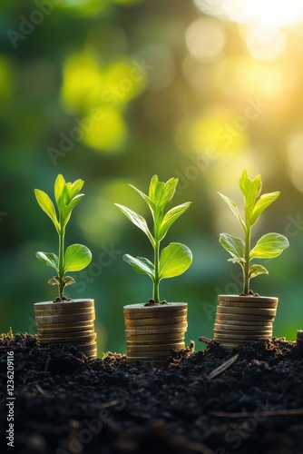 Plants growing from coins, symbolizing investment, financial growth, and sustainable development. Business concepts about profits, savings, and eco-friendly initiatives.