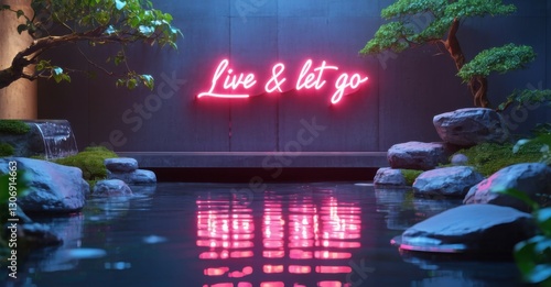 Neon sign live let go deep crimson cyber blue glowing inside minimalist zen garden casting soft reflections stone water fountain