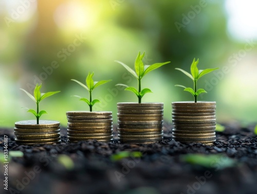 Financial Growth: Seedlings Sprouting from Stacks of Coins in a Natural Outdoor Setting, Representing Investment Returns and Sustainable Wealth