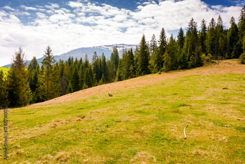mountain landscape with spruce forest in spring. green meadow on the hill on a sunny day. distant carpathian range with peaks in snow under sky with clouds. beautiful countryside scenery of ukraine