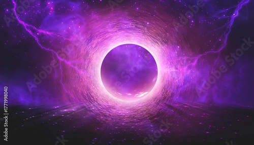 Sci-fi futuristic neon background space, light circle in the center, rays and lines, reflection, smoke.