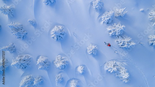 Top down aerial view of a ski mountaineer crossing a pristine winter landscape. Snow covered trees cast long shadows, creating an abstract, minimalist pattern with a sense of solitude and adventure.