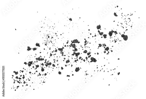 Fresh pieces of asphalt scattered, isolated on white background, top view, design element, clipping