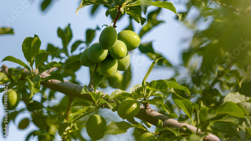 Small green plums on a tree in spring