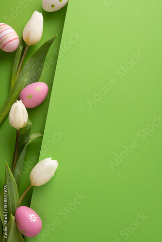 Easter eggs and tulip bouquet on bright green background for spring celebration and greeting