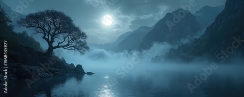 Misty mountain lake scene under full moon. Bare tree on rocky shore. Fog rolls over water and hills. Serene night landscape with dark silhouette. Peaceful atmosphere.