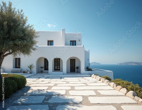 White Mediterranean villa with arches sits on coastal cliff overlooking calm blue sea. Sunny day, clear sky, lush greenery surrounds elegant home. Peaceful ocean view for luxury vacation or residence.