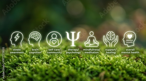 A conceptual pathway illustrates comprehensive mental health management, from stress awareness to well-being and emotional balance integrated with nature.